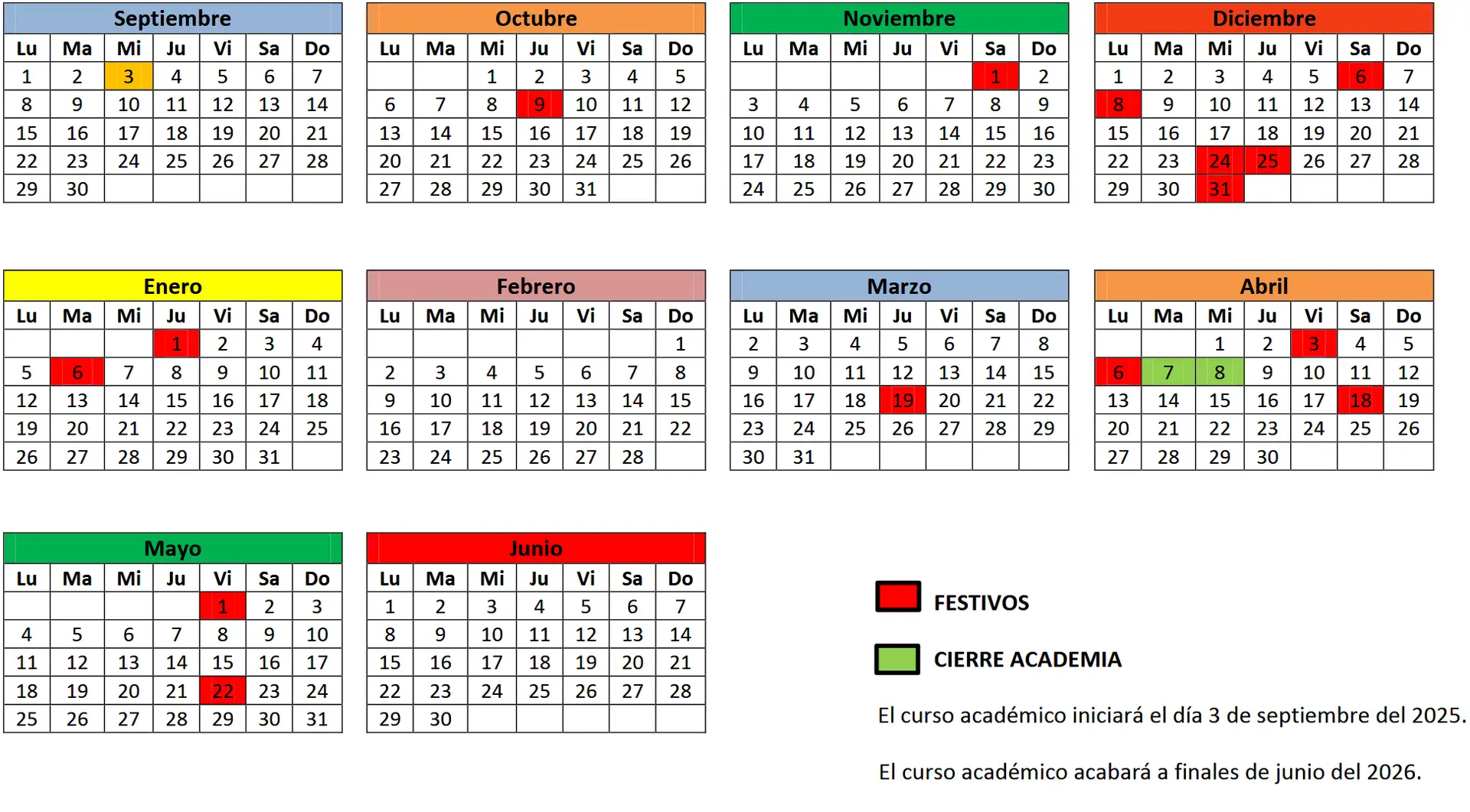 • Día 6 de enero (Reyes), este festivo se verá compensado con la clase extra en el mes de diciembre, que contempla 5 semanas.